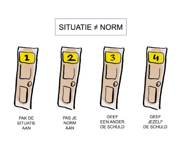 Via deurtje 2 kies je ervoor om je norm aan te passen. Een norm heb je namelijk zelf bedacht, dit is niet iets wat anderen bepaald hebben of je opleggen. Je norm aanpassen betekent dat je kritisch kijkt naar de eisen die je stelt, en deze terugbrengt naar de mogelijkheden die er zijn. Je accepteert de situatie zoals deze is en bent daar tevreden mee. Op het moment dat je je norm aanpast heb je geen energieverlies meer en ervaar je een rustig gevoel.
